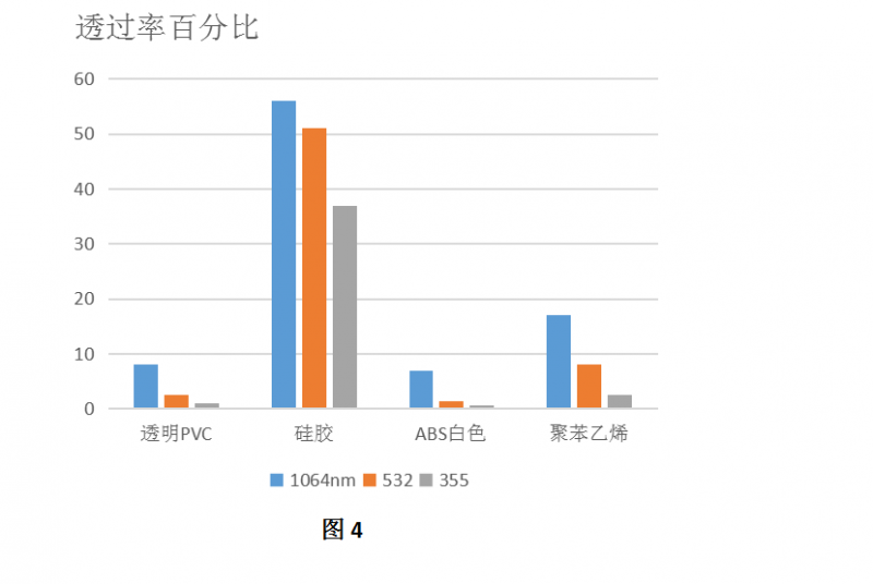 對材質的吸收率因波長而異,圖4紅外(1064),綠光(532),紫外(355)對不同樹脂材質透過率的實驗數據圖,由此可知紫外、綠光激光對PVC、ABS、聚苯乙烯的透過率均低、吸收率均高,可進行良好的刻印。