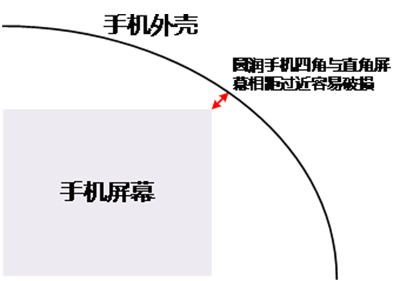 全面屏通常是指屏占比大于80%的手機屏幕,是窄邊框達到極致的必然結果。傳統(tǒng)的手機屏幕長寬比為16:9,呈長方形,四角均是直角。由于要在機身上放置前置攝像頭、距離傳感器、聽筒等元件,所以屏幕和上下機身邊緣均有一定距離。之前的窄邊框一直在盡力縮窄左右邊框,而避免縮窄上下邊框。縮窄上下邊框需要對整個手機的正面部件全部重新設計,難度很大。并且隨著全面屏手機顯示區(qū)域面積的擴大,顯示區(qū)域的直角與手機邊緣的圓角距離也隨之拉近,近距離很容易造成破損(圖1)。因此為減少碎屏的可能和預留元件空間,將屏幕加工成非直角的異形切割變得十分必要。