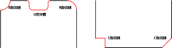 針對全面屏切割目前主流技術有刀輪切割、CNC研磨及激光切割。其中激光切割具有切割尺寸精度高、切縫不變形、切口無毛刺、切割無錐度、切割速度快、切割良率高且能實現(xiàn)任意圖形切割的優(yōu)點,相對于刀輪切割、CNC研磨有明顯的優(yōu)勢。目前手機全面屏異形切割主要涉及L角、C角、R角、U型槽切割(如圖2)。