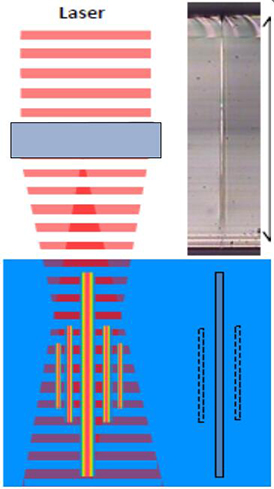 從切割方案角度來看,激光切割分為內蝕切割和隱形絲切(圖3)。內蝕切割利用超短脈沖激光的非線性吸收效應來實現(xiàn)加工,即玻璃中的價帶電子吸收多個光子能量,導致玻璃的價鍵斷裂,宏觀表現(xiàn)為將玻璃材料“打”成微米量級的粉末,粉末因重力的作用脫離玻璃本體,無需裂片裝置,可加工任意形狀,但熱影響區(qū)較大;隱形絲切通過特殊的光學裝置,將激光束壓縮到直徑小、長度大的絲狀光束,玻璃吸收激光能量,形成改質層,因為分子間的作用力,還不能直接分離,需要借助外力進行裂片。隱形絲切能切割直線和部分曲線,熱影響區(qū)小,加工效率高。