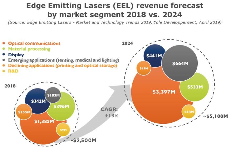 2018年,EEL市場規(guī)模為25億美元,預(yù)計2024年將達到51億美元,復(fù)合年增長率為13%。其增長將繼續(xù)由光通信領(lǐng)域驅(qū)動,例如數(shù)據(jù)通信和電信光學(xué)系統(tǒng)。這些是EEL目前最大的應(yīng)用領(lǐng)域,占據(jù)2018年市場營收的56%。
