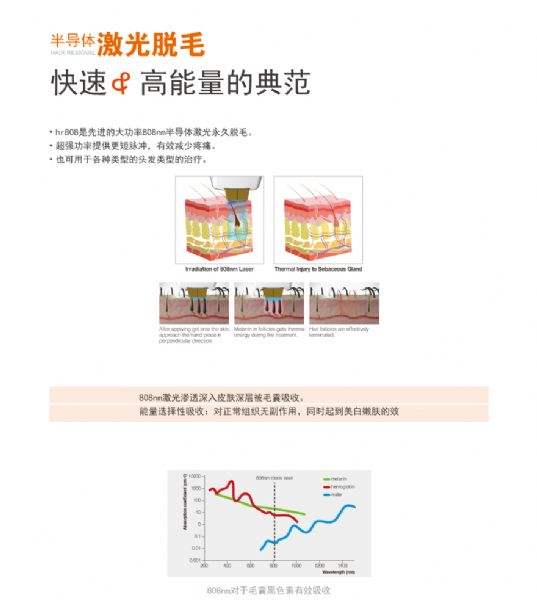 808nm波長的激光可有效穿透皮膚表皮就達到深層的毛囊組織,通過特別設定的脈沖持續時間保障靶組織產生足夠的熱損傷而周圍組織幾乎不受影響;