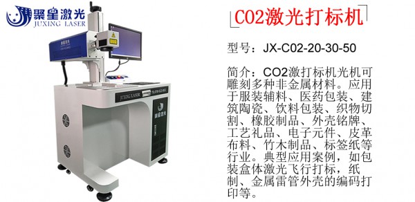 3.二氧化碳激光打標機:可雕刻非金屬和部分金屬材料。廣泛應用于食品包裝、飲料包裝、醫藥包裝、建筑陶瓷、服裝鋪料、皮革、紐扣、織物切割、工藝品、橡膠制品、電子元件、外殼銘牌。