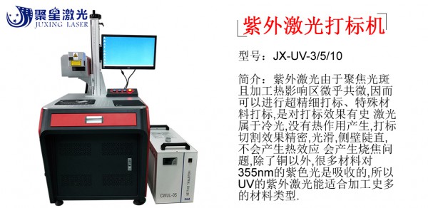 4.紫外激光打標機:紫外激光由于聚焦光斑及小,且加工熱影響區微乎其微,因而可以進行超精細打標、特殊材料打標、是對打標效果有更高要求的客戶首選產品。紫外激光屬于冷光,沒有熱作用產生,達標切割效果精密、光滑、側壁陡直,不會產生熱效應,不會產生燒焦問題,除了銅以外,很多材料對355nm的紫色光是吸收的,所以UV的紫外激光能使和加工更多的材料類型。