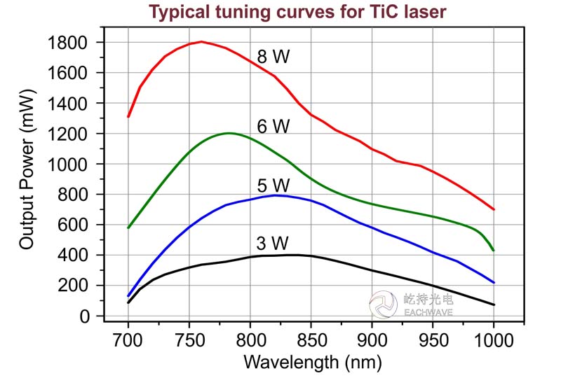 在不同泵浦功率下操作的的TiC激光器的典型波長調諧曲線