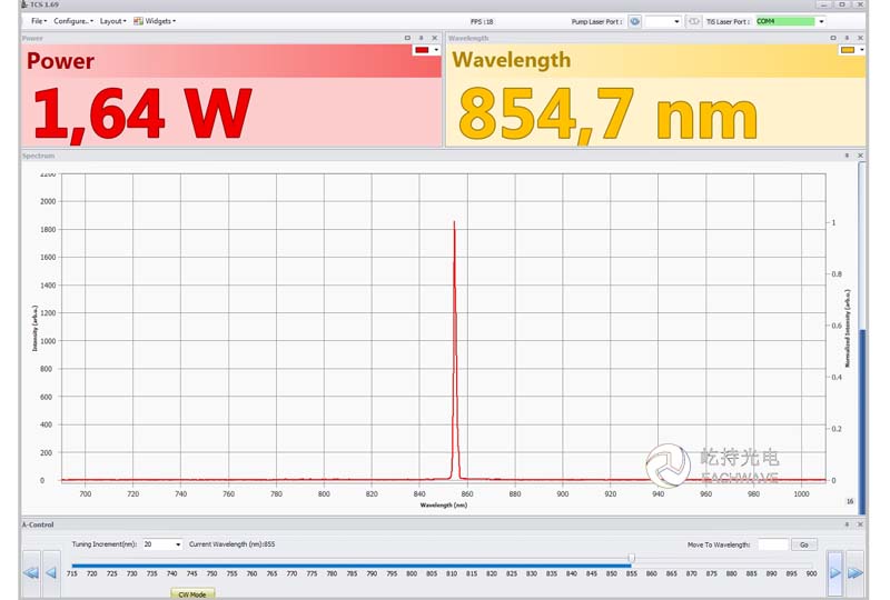 TiC連續可調諧CW鈦寶石激光器Ti:Sapphire CW系統調諧范圍寬,線寬窄。TiC.Ti:Sapphire鈦寶石連續激光器具有寬波長調諧范圍,是許多基礎研究領域工具,尤其是不同的光譜應用。波長調諧由雙折射Lyot濾波器執行,可以通過USB連接到PC的步進電機手動或電動控制??梢赃x擇將兩個標準具放入諧振器中,以便將產生輻射線寬縮小到2GHz。