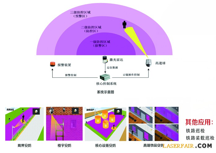 激光雷達憑借高精度、抗干擾等特點,成為重點、敏感區(qū)域的高端安防領域的重要發(fā)展方向之一。本系統(tǒng)具有:全天候快速發(fā)現(xiàn)、定位與軌跡跟蹤、行為分析、立體防護、快速部署、綜合成本低等優(yōu)勢。