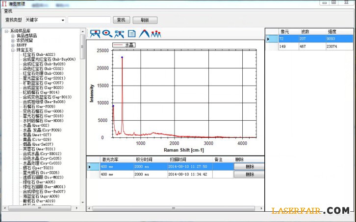 SSR-100G內置有目前全球最全的標準珠寶玉石譜圖庫,譜庫全面覆蓋《GB/T 16552-2010 珠寶玉石 名稱》中81大類,160余種各類寶玉石,共計1200余件樣品,4000余張典型譜圖。譜庫同時還內置了《GB/T 16553-2010 珠寶玉石 鑒定》中的各種物質鑒定方法與相關知識,為設備使用人員提供便利。同時設備支持自建數據庫,用戶可以在日常使用中不斷完善用戶庫。