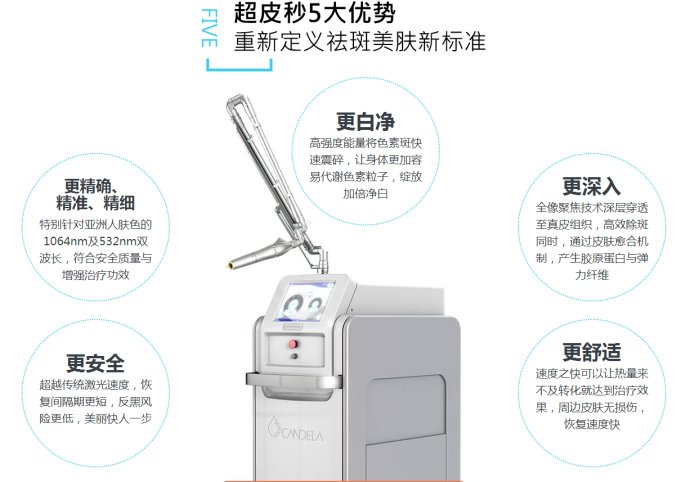 超皮秒的高勻質光斑,能量均一熱傷害少、治療舒適度大大提升,無副作用、恢復期短,除斑破壞力強,可祛除難除小粒子色素。