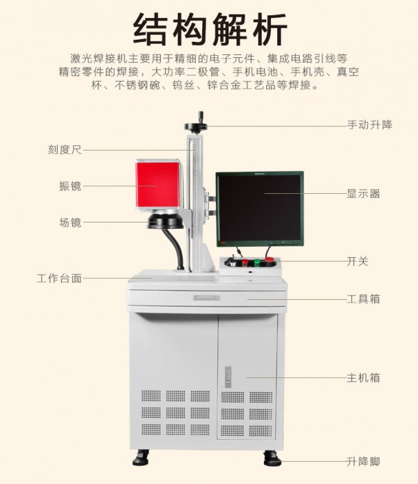 加工速度快,熱變形極小,不影響產(chǎn)品內(nèi)部的電子元件或化學(xué)成分性能。可選配不同焊接范圍的場(chǎng)鏡和焊機(jī)功率,可與相應(yīng)的配套機(jī)構(gòu)相結(jié)合,實(shí)現(xiàn)在線生產(chǎn)。