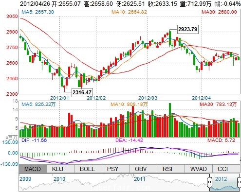 今 開: 2655.07 最 高: 2658.60 最 低: 2625.61 振 幅: 1.24% 昨 收: 2650.13 成交量: 7129894手 成交額: 824999.31萬 換手率: --
