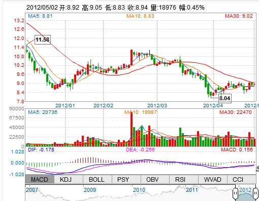 今 開: 8.92 成交量: 18975手 振 幅: 2.47% 最 高: 9.05 成交額: 1693.82萬 換手率: 0.98% 最 低: 8.83 總市值: 17.81億 市凈率: 3.69 昨 收: 8.90 流通市值...