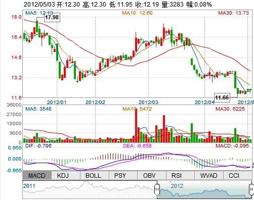 今 開: 12.30 成交量: 3283手 振 幅: 2.87% 最 高: 12.30 成交額: 397.79萬 換手率: 1.93% 最 低: 11.95 總市值: 8.17億 市凈率: 2.63 昨 收: 12.18 流通市值...