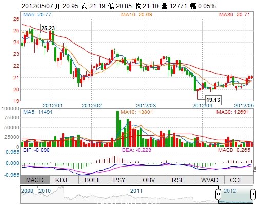 今 開: 20.95 成交量: 12771手 振 幅: 1.61% 最 高: 21.19 成交額: 2687.14萬 換手率: 1.07% 最 低: 20.85 總市值: 90.14億 市凈率: 6.36 昨 收: 21.09 流通...