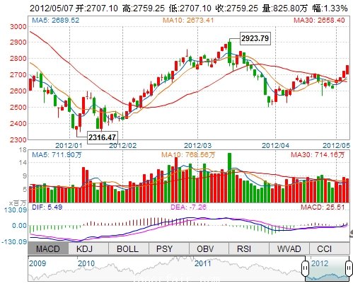 今 開: 2707.10 最 高: 2759.25 最 低: 2707.10 振 幅: 1.92% 昨 收: 2723.06 成交量: 8258024手 成交額: 1101541.23萬 換手率: --