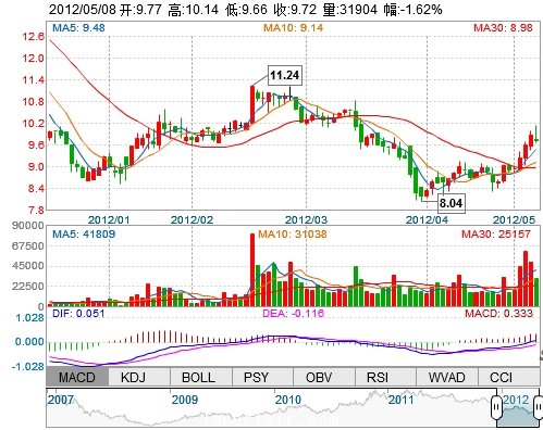 今 開: 9.77 成交量: 31904手 振 幅: 4.86% 最 高: 10.14 成交額: 3143.82萬 換手率: 1.64% 最 低: 9.66 總市值: 19.37億 市凈率: 4.02 昨 收: 9.88 流通市值...
