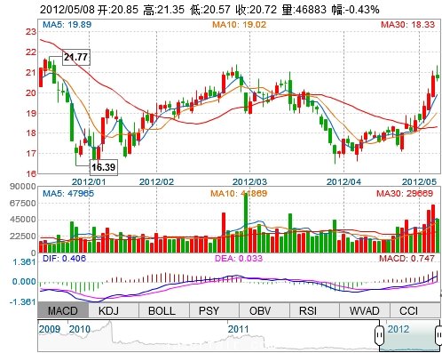 今 開: 20.85 成交量: 46882手 振 幅: 3.75% 最 高: 21.35 成交額: 9782.47萬 換手率: 2.29% 最 低: 20.57 總市值: 61.68億 市凈率: 5.08 昨 收: 20.81 流通...