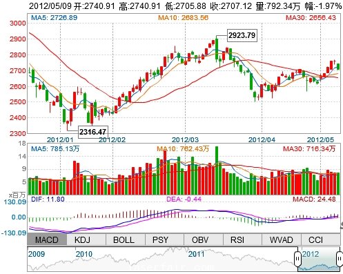 今 開: 2740.91 最 高: 2740.91 最 低: 2705.88 振 幅: 1.27% 昨 收: 2761.56 成交量: 7923354手 成交額: 1003532.75萬 換手率: --