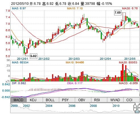 今 開: 6.78 成交量: 39797手 振 幅: 2.04% 最 高: 6.92 成交額: 2732.46萬 換手率: 0.91% 最 低: 6.78 總市值: 29.88億 市凈率: 2.20 昨 收: 6.85 流通市值...