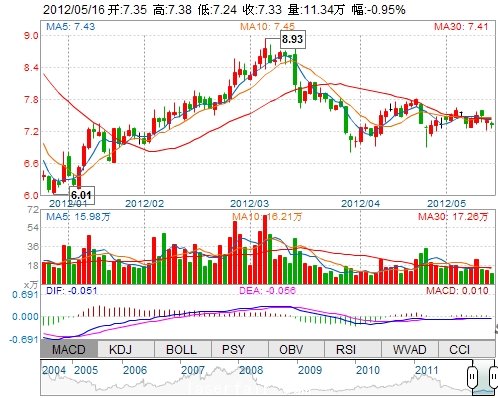 今 開: 7.35 成交量: 113417手 振 幅: 1.89% 最 高: 7.38 成交額: 8301.01萬 換手率: 1.20% 最 低: 7.24 總市值: 76.55億 市凈率: 2.57 昨 收: 7.40 流通市值...
