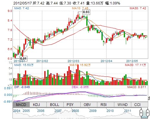 今 開: 7.42 成交量: 136589手 振 幅: 1.91% 最 高: 7.44 成交額: 10080.17萬 換手率: 1.44% 最 低: 7.30 總市值: 77.39億 市凈率: 2.60 昨 收: 7.33 流通市...