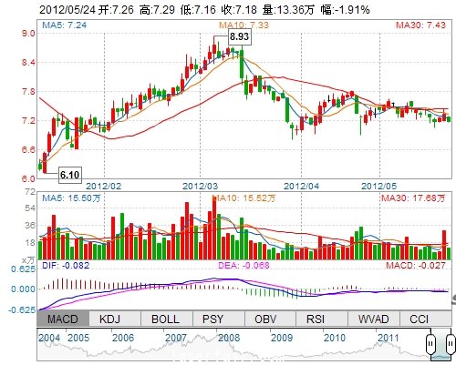 今 開: 7.26 成交量: 133567手 振 幅: 1.78% 最 高: 7.29 成交額: 9650.10萬 換手率: 1.41% 最 低: 7.16 總市值: 74.99億 市凈率: 2.52 昨 收: 7.32 流通市值...