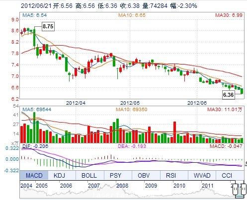 今 開: 6.56 成交量: 74284手 振 幅: 3.06% 最 高: 6.56 成交額: 4763.11萬 換手率: 0.79% 最 低: 6.36 總市值: 66.63億 市凈率: 2.24 昨 收: 6.53 流通市值...