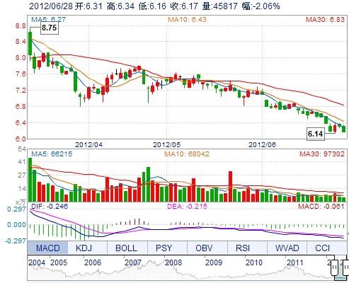 今 開: 6.31 成交量: 45816手 振 幅: 2.86% 最 高: 6.34 成交額: 2867.54萬 換手率: 0.48% 最 低: 6.16 總市值: 64.44億 市凈率: 2.16 昨 收: 6.30 流通市值...