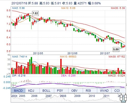 今 開: 5.88 成交量: 42571手 振 幅: 2.04% 最 高: 5.93 成交額: 2497.51萬 換手率: 0.45% 最 低: 5.81 總市值: 61.93億 市凈率: 2.08 昨 收: 5.89 流通市值...