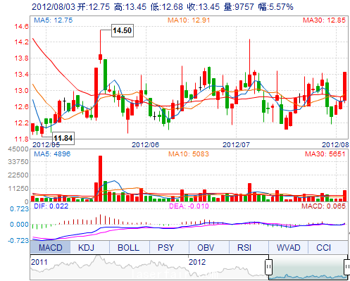 今 開: 12.75 成交量: 9756手 振 幅: 6.04% 最 高: 13.45 成交額: 1289.37萬 換手率: 2.93% 最 低: 12.68 總市值: 9.01億 市凈率: 2.90 昨 收: 12.74 流通市...