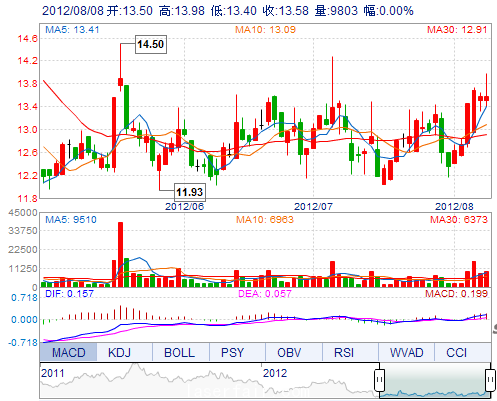 今 開: 13.50 成交量: 9803手 振 幅: 4.27% 最 高: 13.98 成交額: 1341.03萬 換手率: 2.94% 最 低: 13.40 總市值: 9.10億 市凈率: 2.92 昨 收: 13.58 流通市...