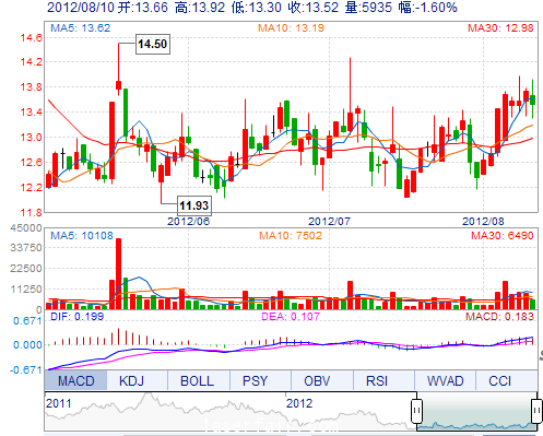今 開: 13.66 成交量: 5934手 振 幅: 4.51% 最 高: 13.92 成交額: 811.34萬 換手率: 1.78% 最 低: 13.30 總市值: 9.06億 市凈率: 2.91 昨 收: 13.74 流通市值...