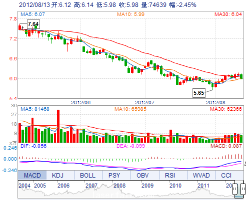 今 開: 6.12 成交量: 74638手 振 幅: 2.61% 最 高: 6.14 成交額: 4523.36萬 換手率: 0.79% 最 低: 5.98 總市值: 62.45億 市凈率: 2.10 昨 收: 6.13 流通市值...