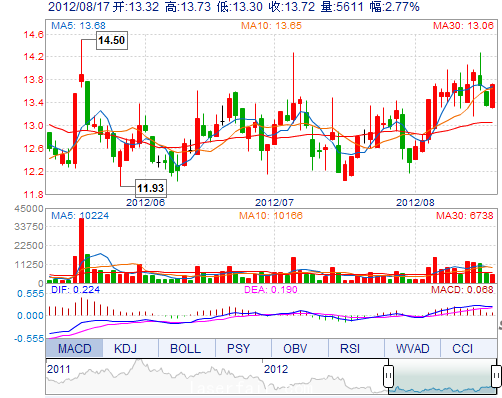 今 開: 13.32 成交量: 5610手 振 幅: 3.22% 最 高: 13.73 成交額: 759.84萬 換手率: 1.68% 最 低: 13.30 總市值: 9.19億 市凈率: 2.95 昨 收: 13.35 流通市值...