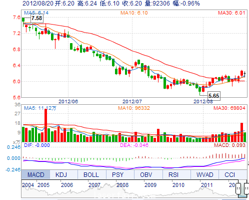 今 開: 6.20 成交量: 92306手 振 幅: 2.24% 最 高: 6.24 成交額: 5678.87萬 換手率: 0.98% 最 低: 6.10 總市值: 64.75億 市凈率: 2.18 昨 收: 6.26 流通市值...