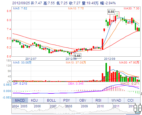今 開: 7.47 成交量: 194878手 振 幅: 4.01% 最 高: 7.55 成交額: 14417.92萬 換手率: 2.06% 最 低: 7.25 總市值: 75.93億 市凈率: 2.70 昨 收: 7.49 流通市...