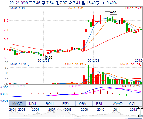 今 開: 7.46 成交量: 164901手 振 幅: 2.28% 最 高: 7.54 成交額: 12268.21萬 換手率: 1.74% 最 低: 7.37 總市值: 77.39億 市凈率: 2.75 昨 收: 7.44 流通市...