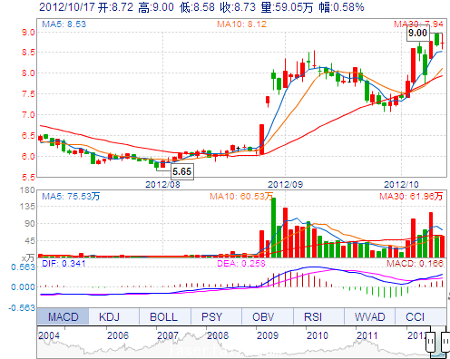 今 開: 8.72 成交量: 590514手 振 幅: 4.84% 最 高: 9.00 成交額: 51907.15萬 換手率: 6.24% 最 低: 8.58 總市值: 91.18億 市凈率: 3.25 昨 收: 8.68 流通市...