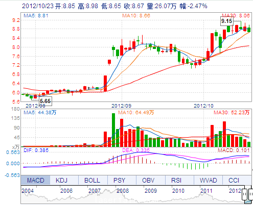 今 開: 8.85 成交量: 260697手 振 幅: 3.71% 最 高: 8.98 成交額: 22873.71萬 換手率: 2.76% 最 低: 8.65 總市值: 90.55億 市凈率: 3.22 昨 收: 8.89 流通市...