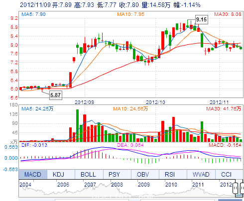 今 開: 7.89 成交量: 145827手 振 幅: 2.03% 最 高: 7.93 成交額: 11415.90萬 換手率: 1.54% 最 低: 7.77 總市值: 81.46億 市凈率: 2.52 昨 收: 7.89 流通市...