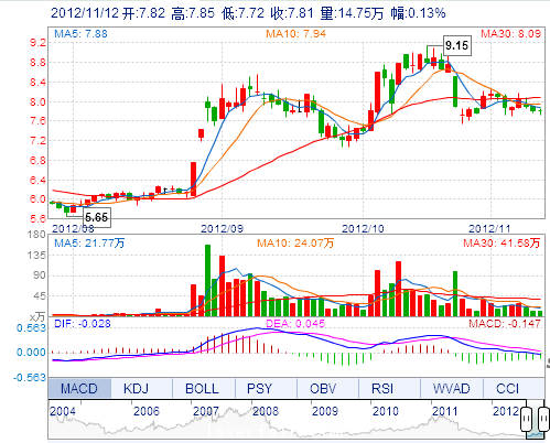 今 開: 7.82 成交量: 147461手 振 幅: 1.67% 最 高: 7.85 成交額: 11466.42萬 換手率: 1.56% 最 低: 7.72 總市值: 81.57億 市凈率: 2.52 昨 收: 7.80 流通市...