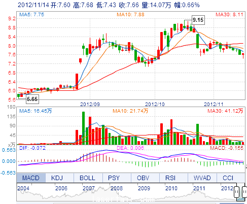 今 開: 7.60 成交量: 140701手 振 幅: 3.29% 最 高: 7.68 成交額: 10626.11萬 換手率: 1.49% 最 低: 7.43 總市值: 80.00億 市凈率: 2.47 昨 收: 7.61 流通市...