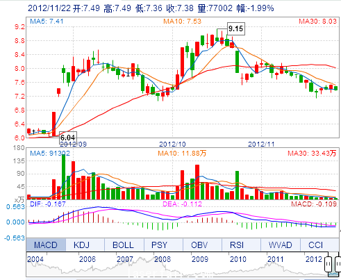 今 開(kāi): 7.49 成交量: 77002手 振 幅: 1.73% 最 高: 7.49 成交額: 5707.14萬(wàn) 換手率: 0.81% 最 低: 7.36 總市值: 77.08億 市凈率: 2.38 昨 收: 7.53 流通市值...