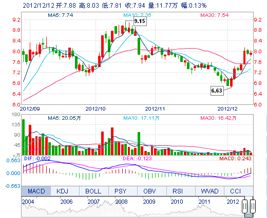 今開: 7.88 成交量: 11.77萬手 振幅: 2.77% 最高: 8.03 成交額: 9310.92萬元 換手率: 1.24% 最低: 7.81 總市值: 82.93億 市凈率: 2.56 昨收: 7.93 流通市值:...