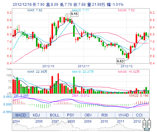 今 開: 7.90 成交量: 21.99萬手 振 幅: 3.89% 最 高: 8.09 成交額: 1.74億元 換手率: 2.32% 最 低: 7.78 總市值: 82.30億 市凈率: 2.54 昨 收: 7.96 流通市值...