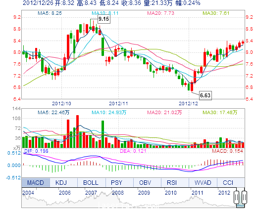 今 開: 8.32 成交量: 21.33萬手 振 幅: 2.28% 最 高: 8.43 成交額: 1.77億元 換手率: 2.25% 最 低: 8.24 總市值: 87.31億 市凈率: 2.70 昨 收: 8.34 流通市值...