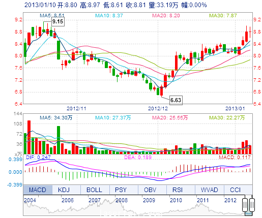 今 開: 8.80 成交量: 33.19萬手 振 幅: 4.09% 最 高: 8.97 成交額: 2.92億元 換手率: 3.51% 最 低: 8.61 總市值: 92.01億 市凈率: 2.84 昨 收: 8.81 流通市值...