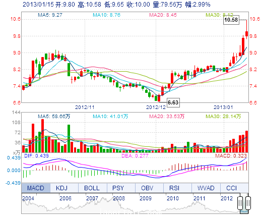 今 開: 9.80 成交量: 79.56萬手 振 幅: 9.58% 最 高: 10.58 成交額: 8.07億元 換手率: 8.41% 最 低: 9.65 總市值: 104.44億 市凈率: 3.23 昨 收: 9.71 流通市...