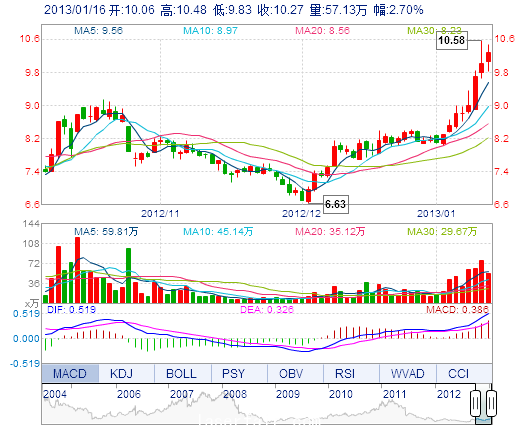 今 開: 10.06 成交量: 57.13萬手 振 幅: 6.50% 最 高: 10.48 成交額: 5.80億元 換手率: 6.04% 最 低: 9.83 總市值: 107.26億 市凈率: 3.31 昨 收: 10.00 流通...