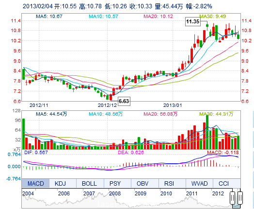 今開: 10.55 成交量: 45.44萬手 振幅: 4.89% 最高: 10.78 成交額: 4.74億元 換手率: 4.80% 最低: 10.26 總市值: 107.89億 市凈率: 3.33 昨收: 10.63 流通市值...